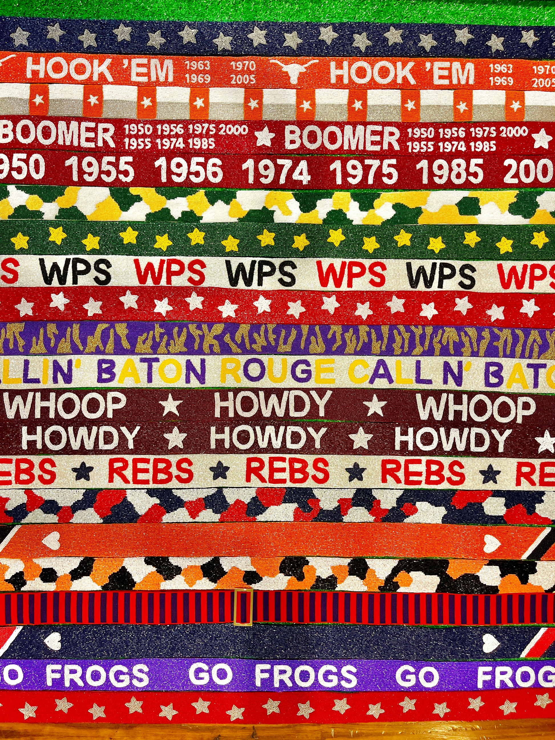 Stars, stripes, hearts, flags let’s have fun with the customization! I wanted to include several teams in my geographic region to start with, namely, University of Texas, A&M, SMU, Ole Miss, New Orleans Saints, Alabama, LSU, Baylor, and Oklahoma! I am happy to welcome any request for a custom order, please just message me on my IG page:@ameslayne_ or email me to get the process started. Please make sure to offer a non trademarked slogan for your request, you can even put your name on it, FUN!