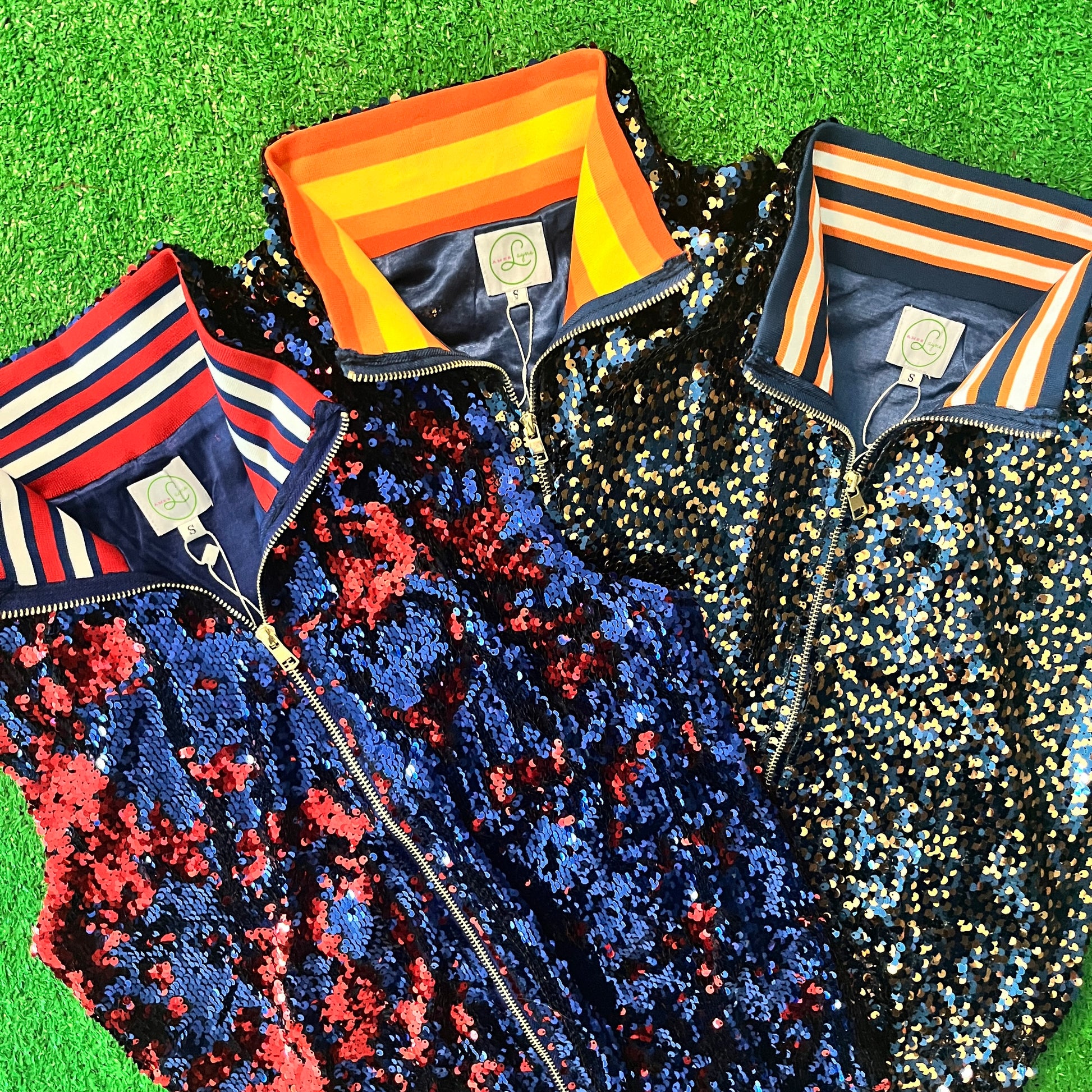 This sequin gameday vest is made of a custom brush over sequin fabric in blue and red ! The collar has a 3" stand up detail, lined with a custom designed stripe rib trim!!
