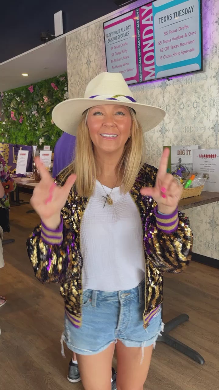 GET THE ORIGINAL TIGER STRIPE SEQUINS here! SUPER FUN CUSTOM DESIGNED Tiger Stripe brushover sequin jacket goes from Black & Gold TIGER STRIPE to PURPLE & GOLD TIGER STRIPE. I designed THE ORIGINAL TIGER STRIPE sequin jacket in 2019 as soon as LSU WON the National Championship!! Perfect for LSU games, Saints games, Mardi Gras, or any place where you want to make a statement. This style is currently sold out but you can pre order here! There may be a few adaptations but I promise you will LOVE it or your money back!