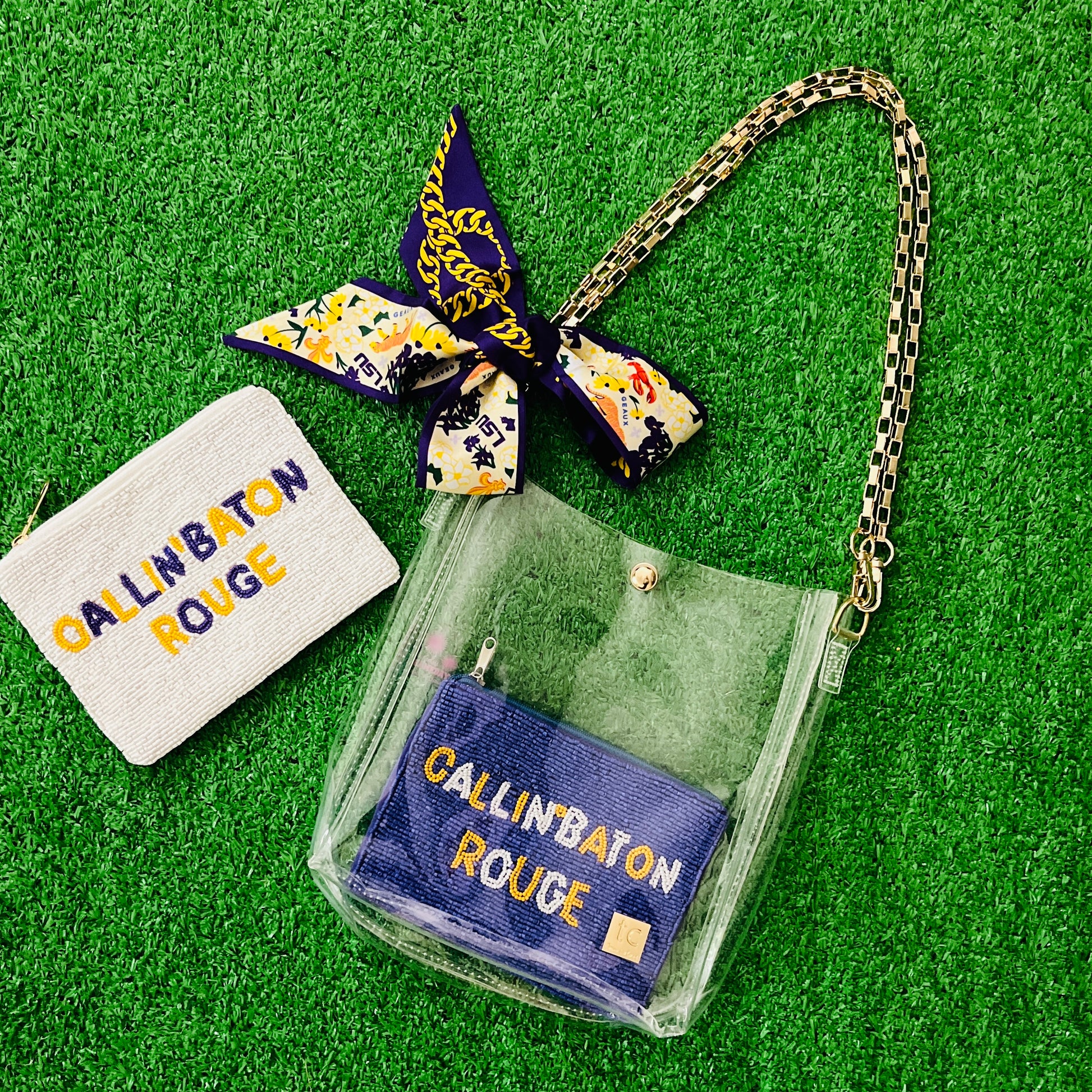 Perfect your clear bag ensemble and conceal your personal items in a chic & spirited way! The Harper custom beaded privacy pouch is custom sized to be the largest “non clear” bag allowable by the Clear Bag policy! Simply place right inside your Hadley clear bag so you can conceal your necessities with a happy smile! Just pop this into your Hadley and you’re all set!