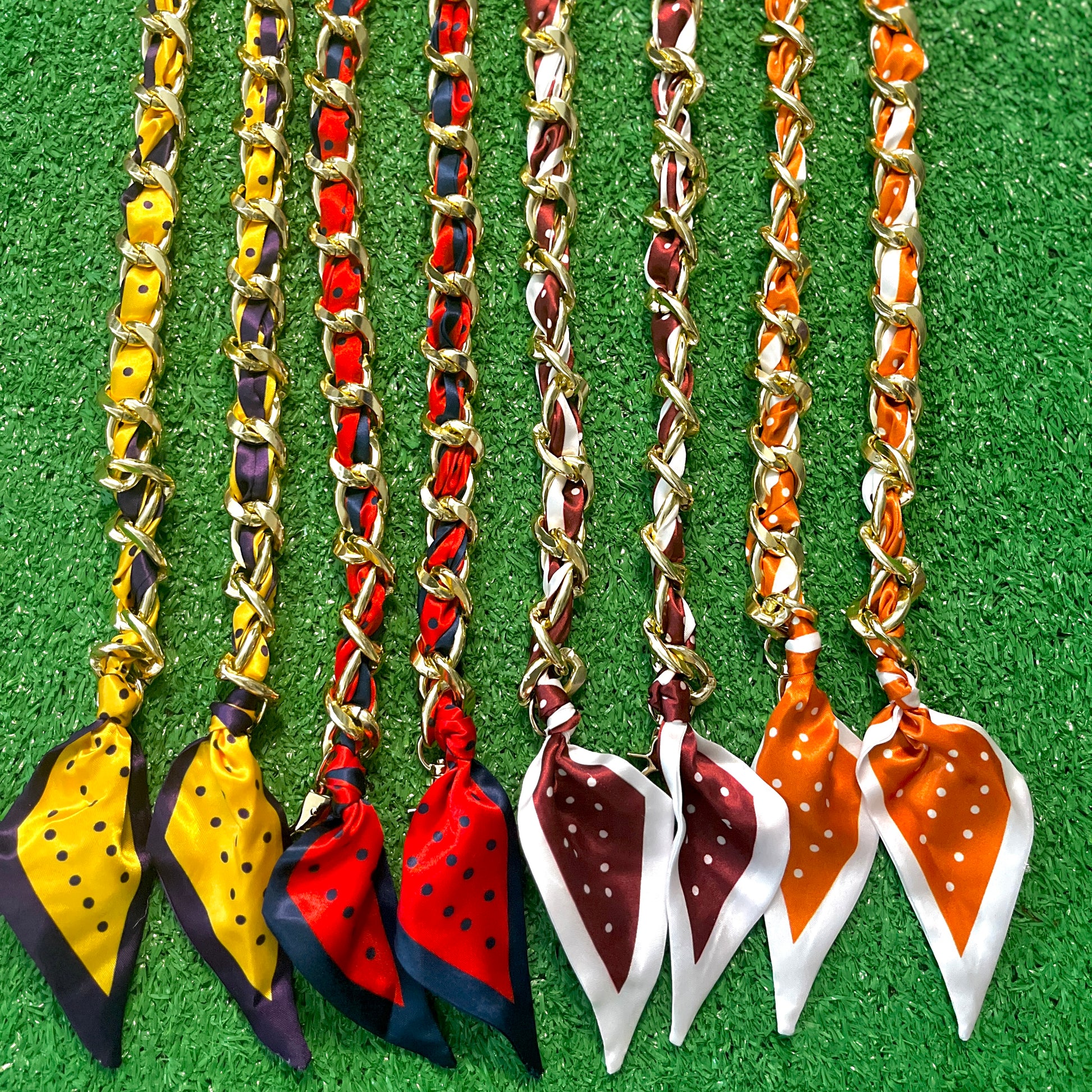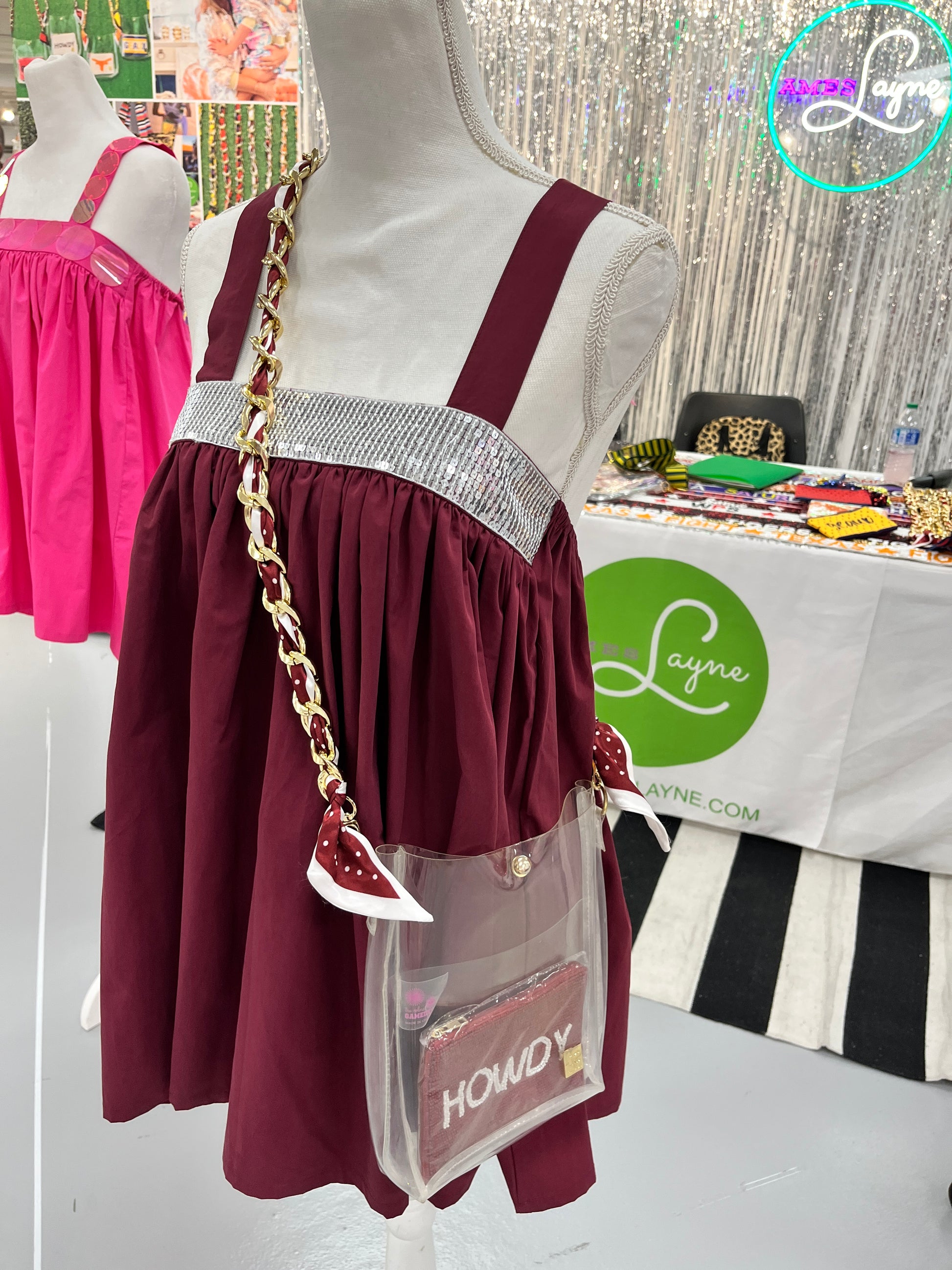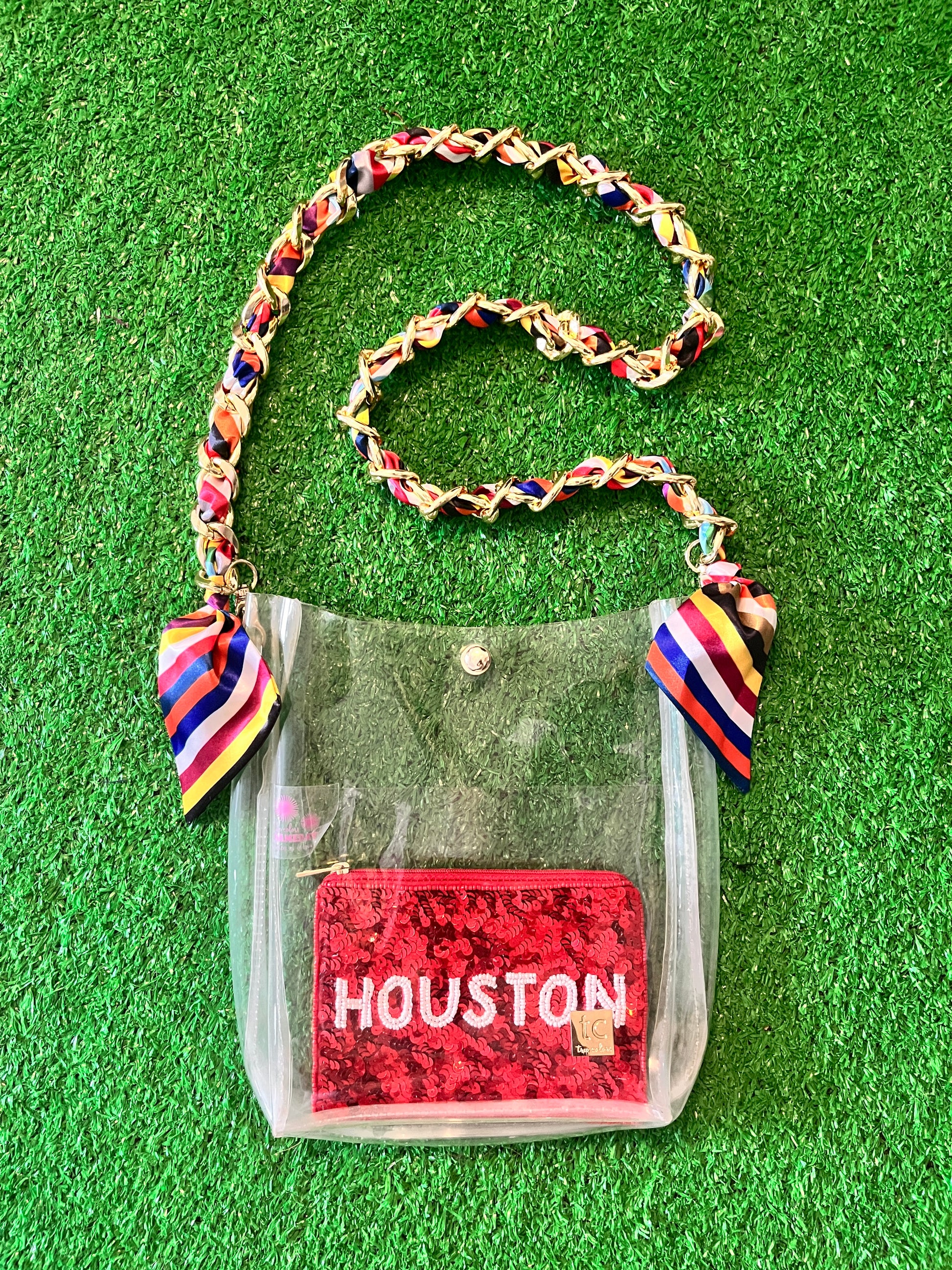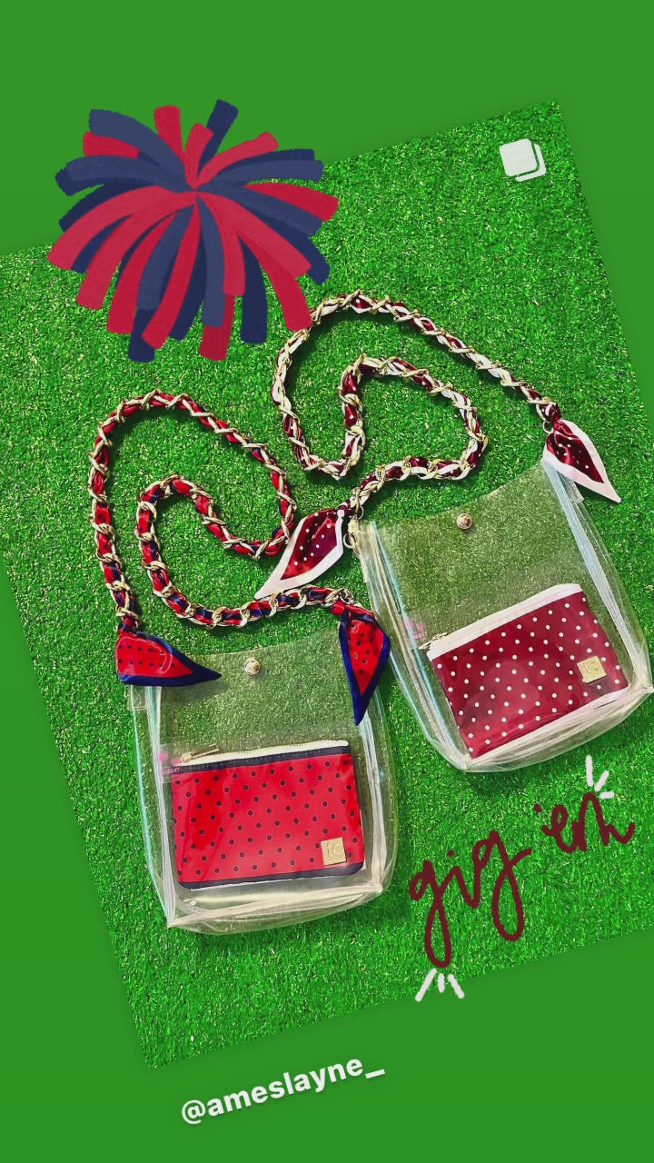 NEW + FRESH + UNIQUE! You’re seeing them here first friends! These are custom printed scarves I had made to be hand woven through a thoughtfully selected jumbo chain link strap. Cute, chic and surely to make a statement for a fresh, cool look on GAME DAY! Simply attach to your Hadley clear bag or even the Hallie clear belt bag. You can also use this with any clear bag with a D or O ring attachment!
