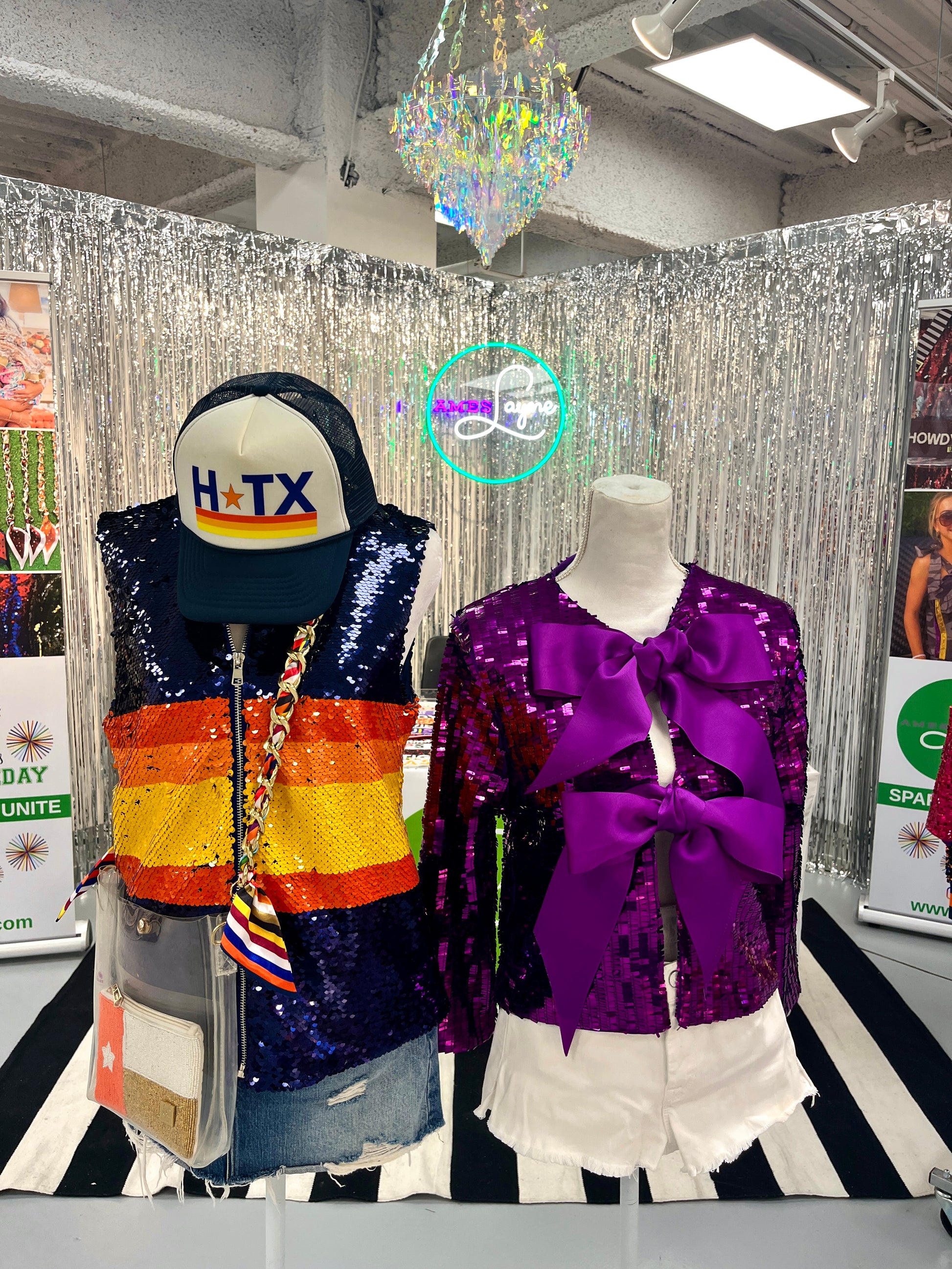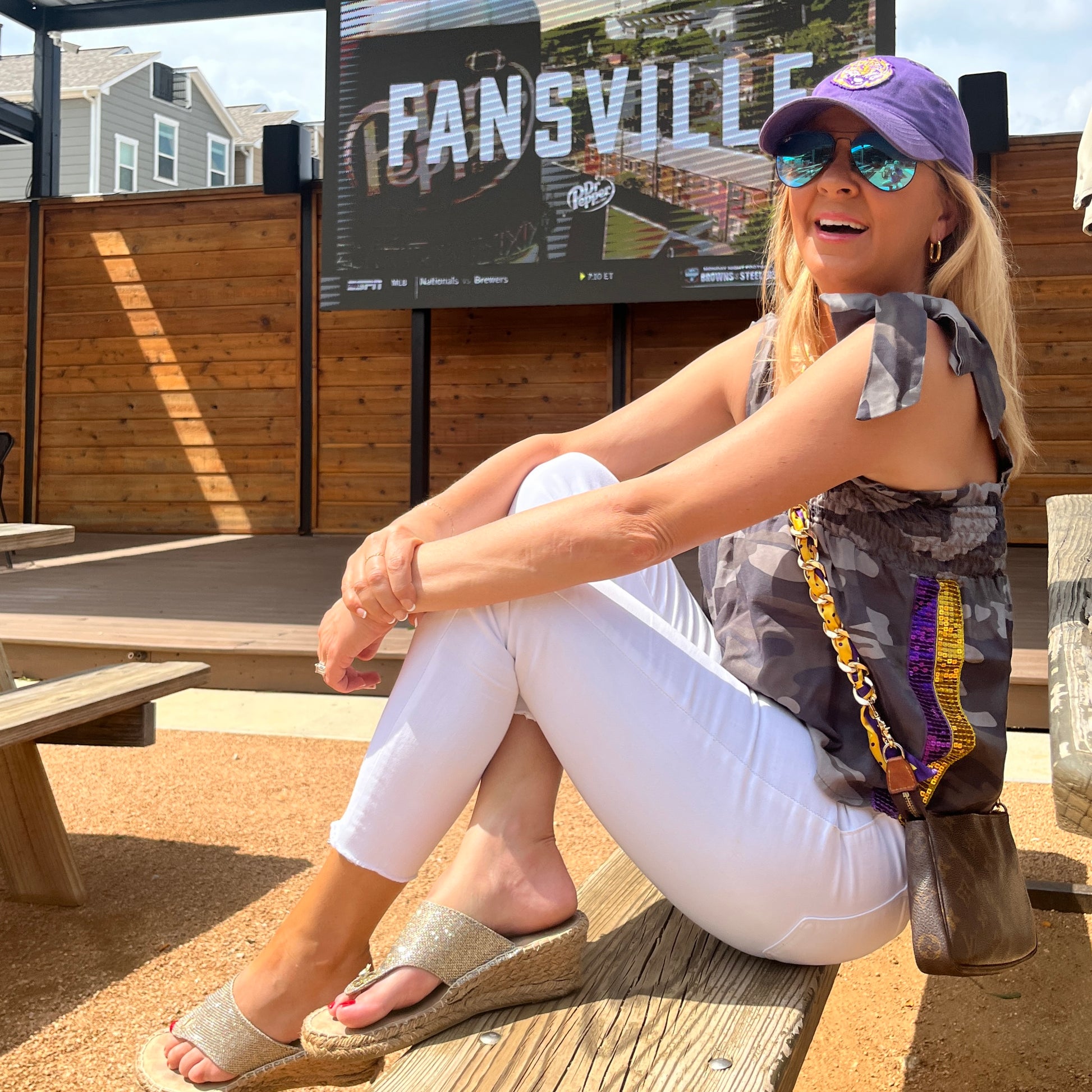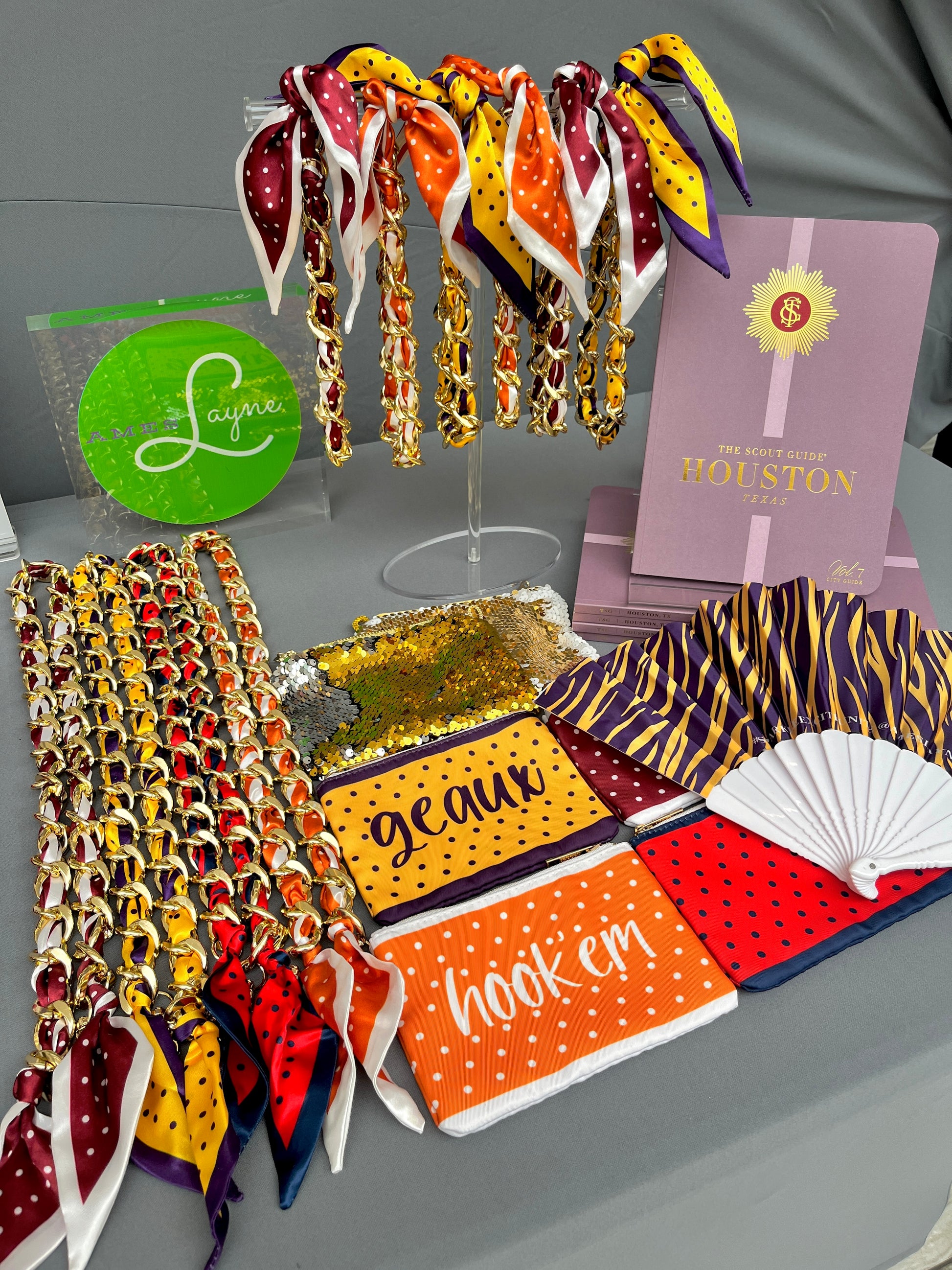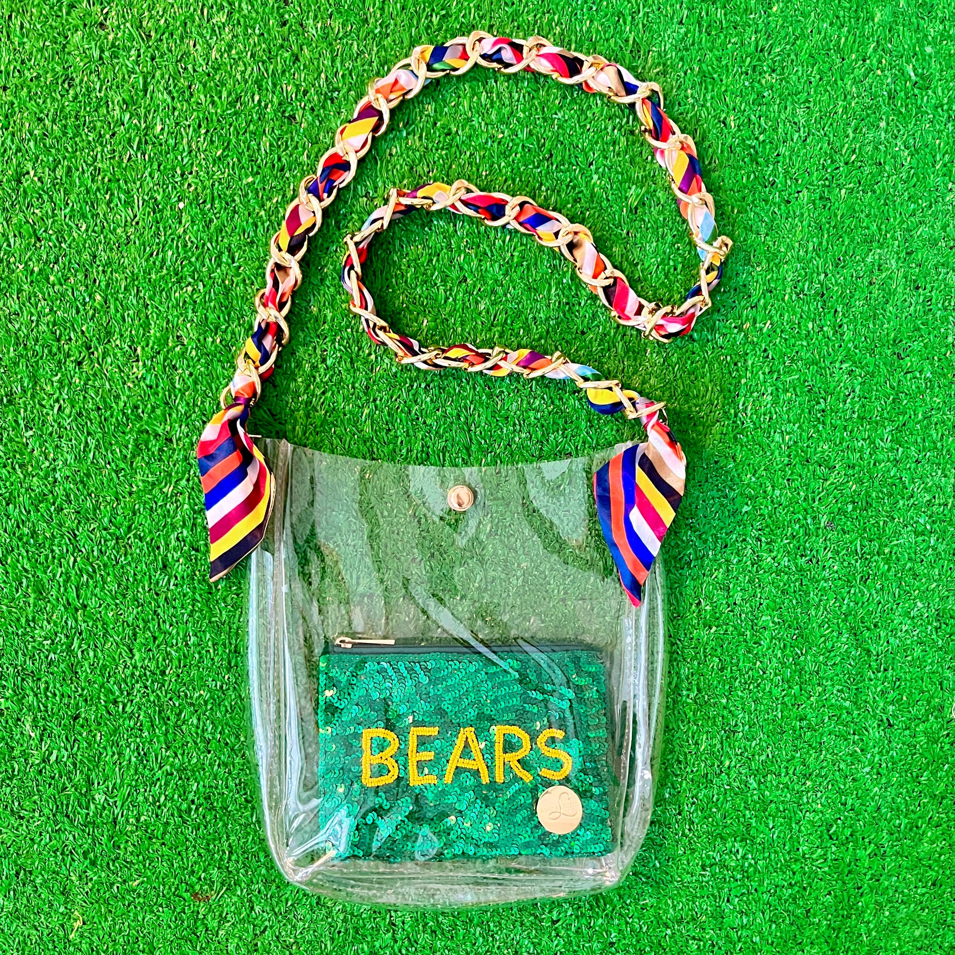NEW + FRESH + UNIQUE! You’re seeing them here first friends! These are custom printed scarves I had made to be hand woven through a thoughtfully selected jumbo chain link strap. Cute, chic and surely to make a statement for a fresh, cool look on GAME DAY! Simply attach to your Hadley clear bag or even the Hallie clear belt bag. You can also use this with any clear bag with a D or O ring attachment!