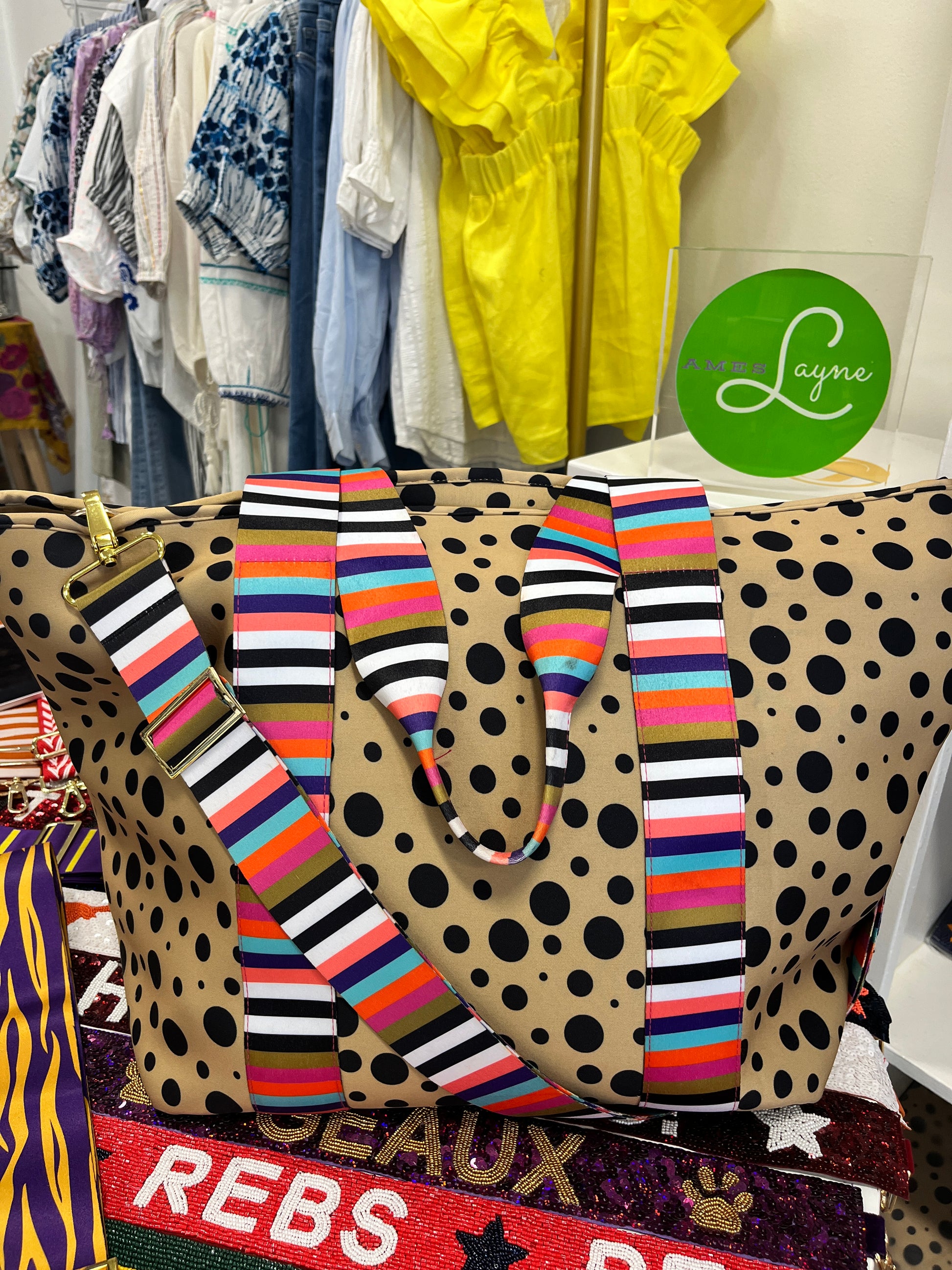 The Whitney Weekender adds even more FUN to your travel plans!! This thoughtfully designed bag is made of a custom neoprene optic dot pattern, an illusion of leopard print with a touch of whimsy!